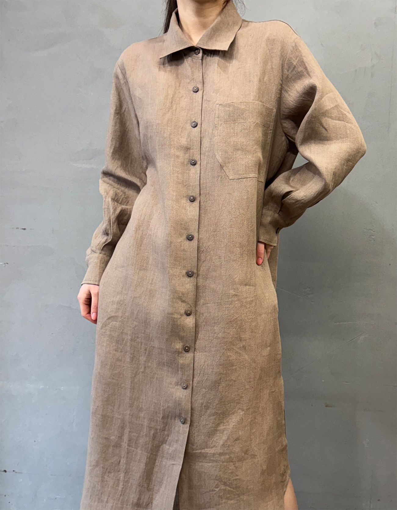 린넨 오픈 셔츠드레스 - 브라운