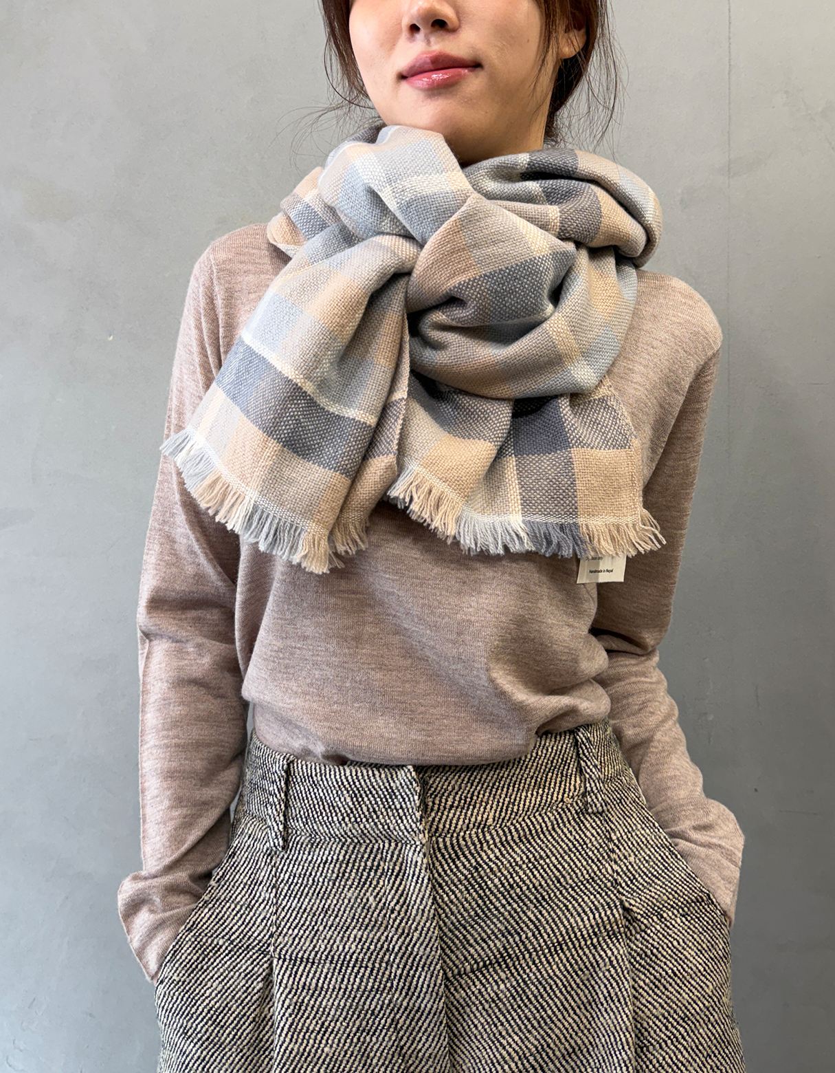 - 캐시미어 바스켓 직조/ 와이드 숄 사이즈/ 그레이&블루&베이지 빅 체크 패턴